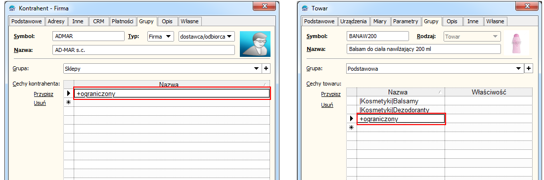 1. Ograniczanie asortymentu pomaga sprecyzować, które towary sa widoczne dla kontrahenta. Aby tego dokonać, należy w karcie kontrahenta dodać cechę, która zaczyna się od znaku plusa. Przykładowo nadajemy cechę "+ograniczony". Następnie identyczną cechę dodajemy do towarów, które widzieć może tylko klient.Operacji przypisania tej cechy, można dokonać również masowo - służą do tego operacje zbiorcze w Subiekt GT.