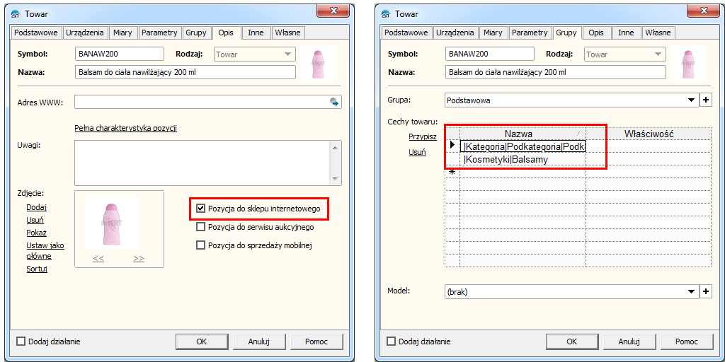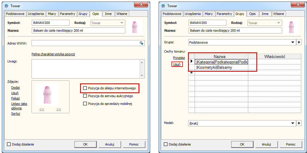Z kartoteki towaru przenoszone są do systemu B2B lub sklepu internetowego Store następujące pola:
