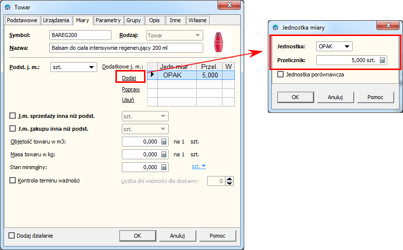- Dodakowe jednostki miary (wraz z przelicznikami)