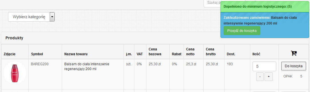 3. Asortyment z mimimum logistycznym, pojawi się w systemie B2B. W momenie wrzucenia do koszyka mniejszej ilości sztuk, niż zakłada ustalone minimum - ilość zostanie automatycznie dopiełniona do ustalonego wcześniej minimum logistycznego.