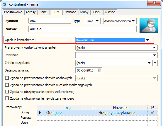 1. W Subekt GT, wejdź do kartoteki kontrahenta, a następnie w zakładce "CRM" - przypisz do niego Opiekuna.